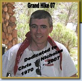 The "Grand Hike" has become an annual tradition, an institution in its own right. Hard to believe it's been 20 years now! Come experience the grandest of all natural wonders up close and personal as you hike through the most scenic place on earth! You'll never forget the feeling of wonder as you gaze from the Colorado River toward the canyon rim, and you'll always cherish the sense of victory when you arrive at the top and retrace the day's journey with your eyes. You'll curse my name the next morning when your limbs feel like lead and your muscles ache with every move. But you'll always be glad you went on the hike and can say "I DID the Canyon!" 2014 marks the 8th year it's been designated the Chris Nicholas Memorial Hike. I'm dedicating these annual outings to the memory of our fellow hiker Chris Nicholas, who was tragically killed by a drunk driver in January of 2007. Chris's favorite hiking destination was the Grand Canyon, so it's befitting that we visit the Canyon in his honor. |